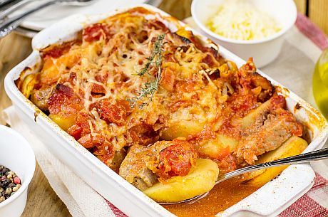 U šerpi zagrejati maslac i maslinovo ulje, dodati iseckano meso pa ga proržiti da porumeni. Nakon toga meso izvaditi i na istoj masnoći propržiti luk, beli luk i papriku. Vratiti meso pa dodati kockice krompira. Sve dobro izmešati i malo prodinstati, na kraju dodati paradajz pire i rendani paradajz pa lepo izdinstati. Po potrebi može se dodati malo vode (trećina čaše).