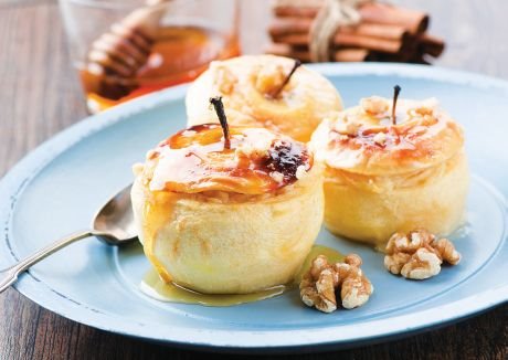 Oljuštene jabuke potopite na desetak minuta u hladnu vodu s limunovim sokom. Pažljivo im izdubite sredinu, pa ih poređajte u podmazanu vatrostalnu posudu, posutu šećerom. Jabuke napunite mešavinom mleka, lešnika, cimeta, karanfilića i rendane limunove kore. Zaitm ih prelijte višnjevačom i komadićima putera, i pecite 15 minuta na 180 stepeni. Pečene jabuke ohladite i ukrasite višnjama.