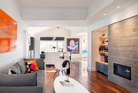 Dnevna soba je i spavaća soba za roditelje, a od kuhinje i trpezarije može se odvojiti harmonika vratima, koja su, kada su otvorena, skrivena između plakara. Garderoberi moraju biti i u toj sobi, jer ih inače neće biti dovoljno za petočlanu porodicu. Za frontove birajte što neutralniji materijal i svetle boje, i stavite skrivene ili što diskretnije ručice.