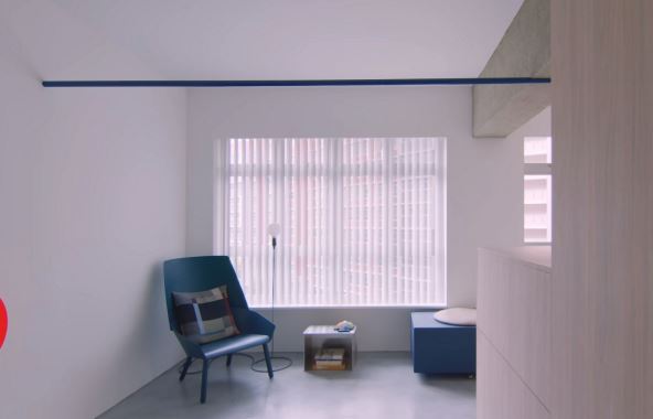 U enterijeru dominiraju neutralne boje i skrivena mesta za skladištenje stvari, dok akcenti u plavoj i narandžastoj unose energiju i balans, u skladu sa feng šui principima. Sve je podređeno ideji da jedan stanar ima kontinuiran, otvoren prostor bez viška detalja.
