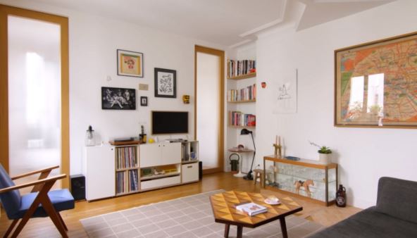 - Uklanjanje suvišnih zidova i uvođenje jedne strukturirajuće pregrade otvara vizuru i omogućava fluidan svetlosti i kretanja u malom stanu.