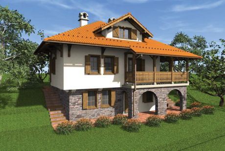 Nova tradicionalna šumadijska kuća koristi elemente stare kuće – bele malterisane zidove, potamnelo drvo, krov na četiri vode i crep.