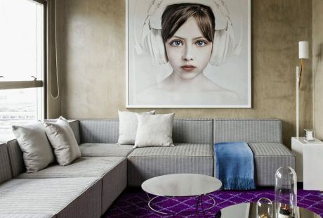 Klasičan stan u svetlijim nijansama sive oplemenio je jakim bojama poput ljubičastog tepiha i žute trpezarije. Posebu pažnju privlači neobična slika u dnevnom boravku i fotelja u obliku spirale.