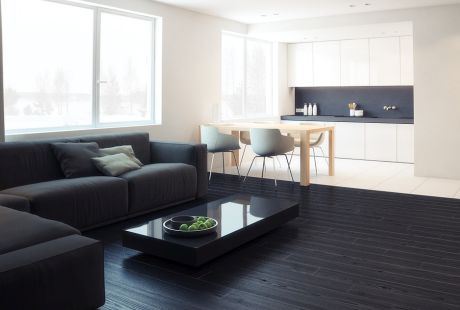 Dnevni boravak krasi brodski pod u crnoj boji, ali nastavlja se na odlične pločice u toploj beloj nijansi i kuhinji u kojoj samo jedan deo zida u istoj boji sa tamnim "svetom" dnevnog boravka.