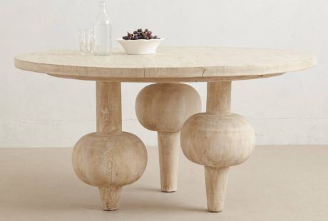Izrađen od reciklirane jelovine, ovaj sto je u završnom sloju voskiran tako da dobije sivkastobeli ton a zanimljiva kompozicija sa tri masivne noge daje mu gotovo skulpturalnu lepotu. Visina stola je 76 centimetara, a prečnik table 1,5 m.