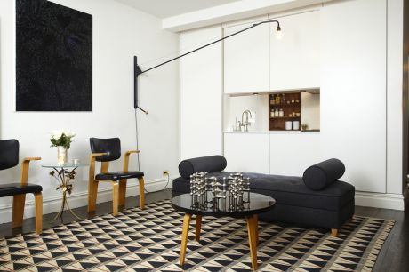 U kuhinji ćete otkriti da se uz luksuzni mermer savršeno uklapaju skromne bele pločice poznate kao "metro" model jer su njime ukrašene najstarije stanice škripave i vrele podzemne železnice Njujorka. U dnevnoj sobi, oduševiće vas sklad oblika i jednostavnost kombinovanja boja, ali je apsolutna zvezda ove enterijerske priče ogromna crna polica kroz čije se stepenište penjete na drugi nivo stana.