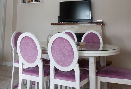 Na podu je postavljen laminat, a poseban efekat stvara šebišik tepih, sa osnovom koja imitira rustičan brodski pod i romantičnim cvetnim dezenom u uglovima. U trpezarijskom delu, garnitura odgovara i modernom i šebi šik stilu: bele stolice i ovalni sto usklađene su s tepihom zahvaljujući meblu plišanog tkanja u boji jorgovana. Sa elipsom stola usklađen je i spušteni plafon od gipsanih ploča.