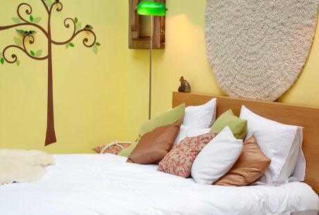 Osnovna bledožuta boja zidova predstavlja neutralnu ali vedru pozadinu za vaše najrazličitije rukotvorine. Iznad uzglavlja je jednostavna vunena tapiserija, koja oblikom podseća na sunce i daje blagu etno atmosferu prostoriji. Na drugom zidu je efektna kombinacija drveta od samolepljivog tapeta i figurice ptica koje su pričvršćene na ovu "trodimenzionalnu sliku". Jednostavno drveno uzglavlje i masivni ram na zidu obezbedjuju kontrast zahvaljujući toplim smedjim nijansama, a dezeni jastučića ujedinjuju čitavu sliku.