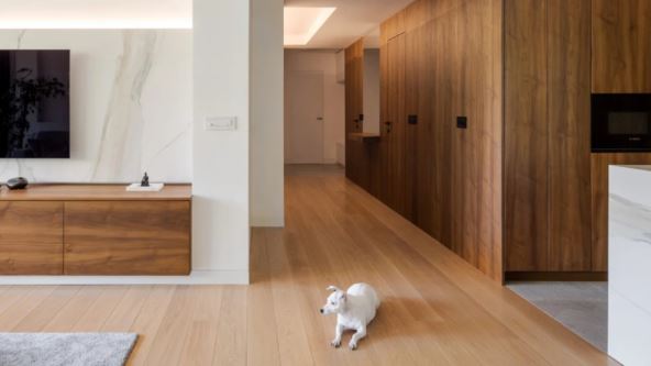 Jedna od važnih odlika apartmana JU, čiji su autori arhitekteStudija Fluid, jeste prostrana dnevna zona sa kuhinjom skrivenom iza kliznih vrata, koja vizuelno pročišćuju ambijent i od korisnika zahtevaju akciju. Kada su vrata zatvorena, veliko mermerno ostrvo, u kombinaciji sa različitim teksturama drveta, osvetljenjem i tekstilom koji ga okružuju, deluje kao apstraktni umetnički predmet ili deo neke scenografije.