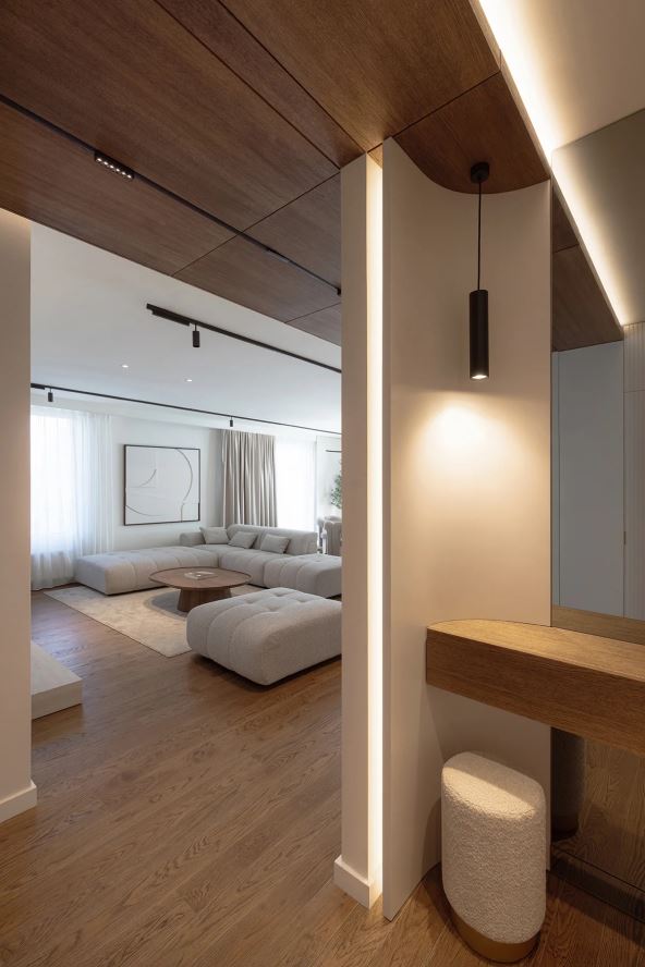 Prostorno zoniranje rešeno je plafonskom oblogom od drveta. Ovaj element proteže se od ulazne zone, kroz hodnik, do kraja kuhinjskog bloka, čime jasno definiše osu kretanja i servisni deo stana. Na taj način je prostor kuhinje i kretanja vizuelno izdvojen od dnevnog boravka, dajući mu intimniji karakter, piše SuperProstor.