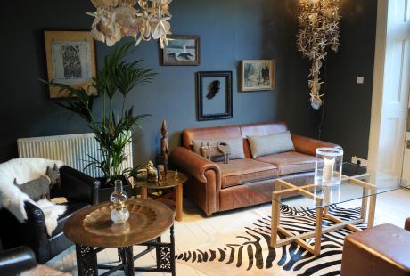 Tamni zidovi pretežno obojeni u sivu pružaju osećaj intimnosti i ušuškanosti čitavom domu. Raznoliki komadi nameštaja poput vintidž braon kožne sofe ili stočića u marokanskom stilu otvaraju prozor u Španiju 15. veka, dok na prvi pogled nasumično, ali veoma brižno odabrani detalji sa putovanja magično uvode različite kulture sveta u stotinak kvadratnih metara jednog doma.