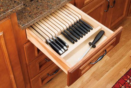Iako su držači za noževe veoma praktični, teško je pronaći im mesto u kuhinjama manjih dimenzija a mnogi ih ne smatraju bezbednima. Ukoliko želite da svoj set noževa odvojite u poseban držač, a na kuhinjskom pultu nema dovoljno mesta, dopašće vam se ideja kompanije „Rev-a-šelf“, koja je pronašla idealan način da se oštri noževi odvoje od ostatka kuhinjskog pribora – postolja dizajnirane specijalno za ovu namenu.