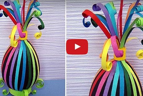 Obojite jaje u crno i isecite papire u bojama na dugačke trakice. Trakice rasporedite kao u video prilogu, a zatim ih stavite na jaje. Vrhove trakice zavežite i makazama uvijte. Ukoliko želite da jaje izgleda još lepše onda napravite postolje od papira.