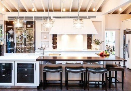 Elegantna kuhinja na prvi pogled ne podseća na standardnu kuhinju već na produženi deo dnevnog boravka gde se priprema hrana i druge kućne aktivnosti "susreću" u udobnoj i ovom slučaju glamuroznoj atmosferi. Kombinovanjem vrlo efektne ali i jake rasvete – osvetljenje krasi plafon, ali se nalazi i ispod kuhinjskih elemenata u radnom delu – s belom, čistom bojom i vrlo "bleštavim" materijalima – metalom, mermerom i staklom – Mik je uspeo da dobije jednu "sjajnu" kuhinju. Premda se sastoji od mnogih elemenata, kuhinja"Kod kuće" se ipak čini nekako laganom i prozirnom. U prvom planu dominira beli mermer Ceaserstone, sjajne belozlatne pločice koje nalik tapetu dekorišu kuhinju i elegantne drvene stolice nalik barskim stolicama koje se nalaze oko "jutarnjeg" bara.