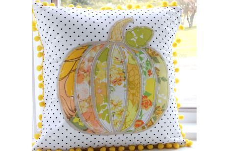 Od tkanine za jastučnicu isecite 3 parčeta - širine oko 28 cm, a dužine 28 (1 komad) i 20 cm (2 komada). Na najveći deo prištepajte bundevu. Sašijte jastučnicu tako što će se dva dela od 20 cm x 28 cm na poleđini preklapati kao na koverti. Time štedite posao ušivanja dugmića ili rajsferšlusa.