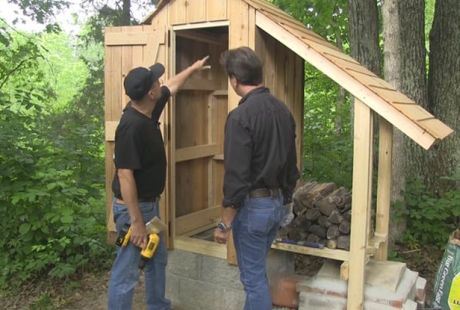 Jedna strana krova ima duži ram tako da se daščice pružaju sve do stubova i prave zaštitu od kiše za malo spremište za drva.