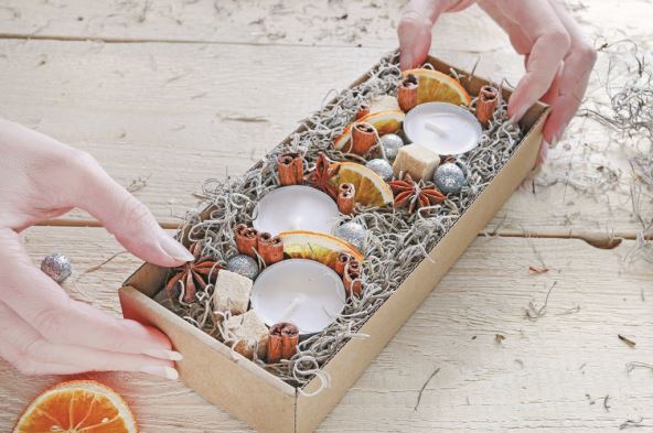 Kutija, sunđer, svećice, kolutovi pomorandže, štapići vanile i cimeta, anis, pištolj za lepljenje, veštačka „trava” za aranžiranje...