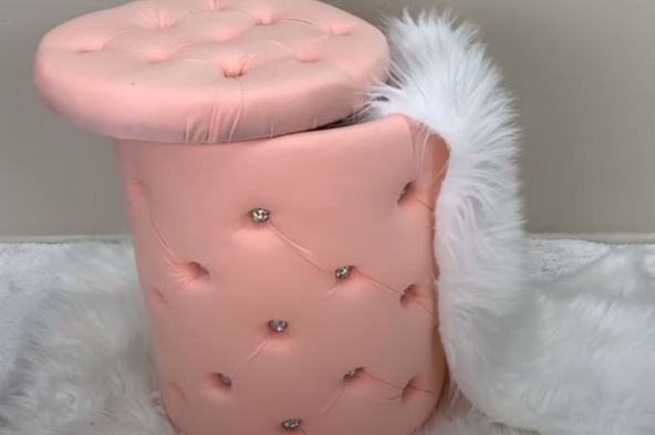 Za oblaganje kante upotrebljen je sunđer debljine 1 cm koji treba prilepiti po celoj spoljašnjoj površini. Mesta koja će imitirati "dugmad" za tapaciranje, obeležite tako što ćete flomasterom nacrtati krstiće. Usecite sunđer na tim mestima vrhom makaza. Obložite celu površinu sunđera tankim sintetičkim filcem za punjenje pa na njemu ponovite postupak sa prosecanjem rupica.