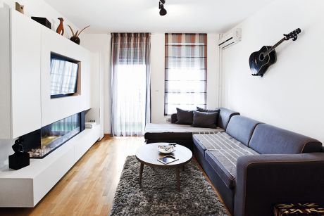 Udobna ugaona garnitura mesto je za odmor i gledanje TV-a, a kada dođu gosti, pruža dovoljno prostora za brojnije društvo, dok se u slučaju potrebe u dva poteza pretvara u udoban ležaj. Veštom kombinacijom gipsa i medijapana napravljena je i centralna tačka ovog stana, atraktivan kamin koji daje posebnu atmosferu. Ostave ispod i pored njega kriju od pogleda sve stvari neophodne u jednom domaćinstvu. Ugao dnevne sobe kutak je za ljubimca Grofa, engleskog buldoga, čija se mirna narav savršeno uklopila u ovaj harmoničan i skladan dom mladog para.