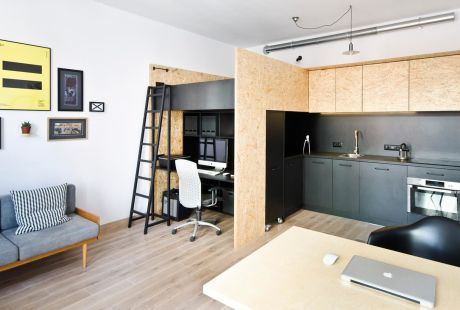 Ove zahteve dizajneri su prvobitno ispunili razdvajanjem prostora za rad od kuhinje pomoći iverice. Međutim, ova iverica pored kuhinje i radnog dela krije i deo za spavanje, kao i skriveni deo za decu. Otvaranjem polica nailazite na pravo dečije carstvo igračaka, dok merdevine pored prostora za rad vode ka delu za spavanje.