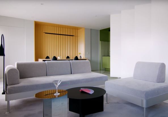 Umesto klasičnih pregradnih zidova, svaki deo stana definisan je jednom bojom i specifičnim materijalima. Dnevni boravak, kuhinja i trpezarija sada čine jedinstven otvoreni prostor, ali su vizuelno razdvojeni koloritom i teksturom.