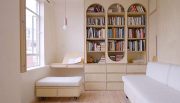 Soba služi i kao spavaća i kao dnevni boravak, a u jednom uglu je i udobno mesto za rad - ploča za pisanje i crtanje može da se podigne, a udobno sedište s tapaciranim jastukom se pomera na točkićima. Ispod jastuka je prostor za skladištenje stvari.