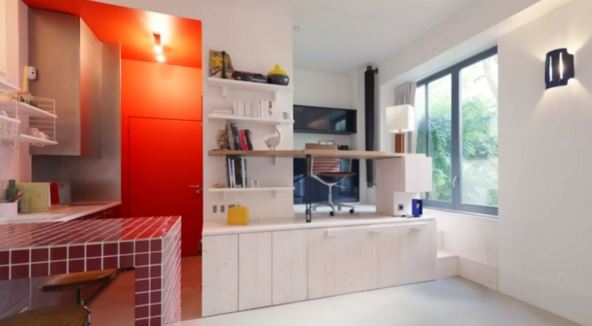 Na platformi od borovine smešten je radni kutak. Sto od recikliranog hrasta povezan je sa policama za izlaganje dizajnerskih predmeta, a plavi ormarići deluju veoma praktično. Ispod platforme je klizni bračni krevet na točkićima, koji se lako uvlači i izvlači, pa prostor može da se menja prema potrebi. Deo stola postaje noćni stočić sa utičnicom za lampu, a visina konstrukcije omogućava da se krevet skloni zajedno sa posteljinom.