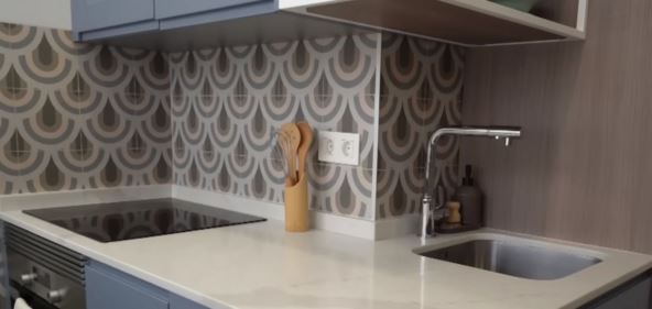Ulaz je direktno u kuhinju, koja je oblikovana kao ćirilično slovo G, vrlo vešto i funkcionalno. Sa desne strane su kombinovani frižider i zamrzivač, ugrađeni u ormariće sa plavosivim frontovima koji daju moderan, smirujući izgled. Odmah pored je sudopera, a radna površina se nastavlja pod pravim uglom ka desno, gde su grejna ploča sa dve ringle i rerna.