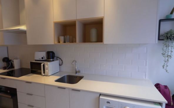 Radna površina je izuzetno duga što je u malom stanu prava retkost i ogromna prednost. U gornjem delu, kombinovani su zatvoreni elementi i otvorene police, tako da kuhinja deluje veoma svetla.