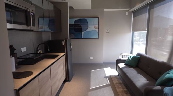 Iz antrea se ulazi u dnevni boravak i kuhinju koji zauzimaju centralni deo stana. Sa desne strane je kuhinja neobično kombinovana - na visećim elementima su ogledala, dok su donji ormarići u boji drveta.