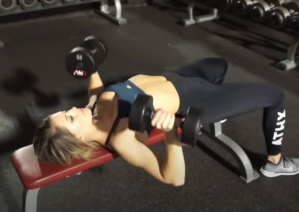 Ova vežba će vam omogućiti da ležite na leđima na nagnutoj klupi, držeći tegić u svakoj ruci. Držite jezgro čvrsto i ispružene ruke dok postavljate tegove ispred grudi. Udahnite i postepeno pomerajte jedan od drugog dok vam ruke i grudi ne budu poravnati. Napravite pauzu, izdahnite i postepeno vratite ruke u početni položaj. Završite 3 seta od 15 ponavljanja.